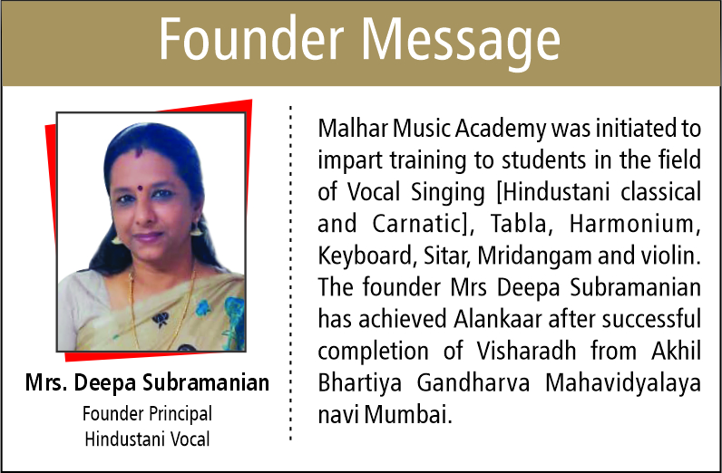 Malhar Music Academy Navi Mumbai was founded in the year 2010 on the auspicious Dussehra Day, and since then, the Academy has been training Students in Hindustani Classical Music. Malhar Music Academy is rendering training on Hindustani Classical Vocal, Tabla, Keyboard, Harmonium, Flute, Sitar to over 100 Students of age groups above 6 years, with the support of learned Faculty Members who are Visharadh and Alankar in their respective Genres. Malhar Music Academy follows the curriculum prescribed by Akhil Bhartiya Gandharva Mahavidyala. Children also give their respective Examinations from Gandharva Mahavidyalaya.